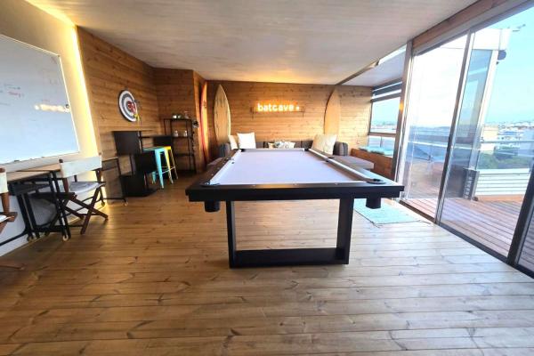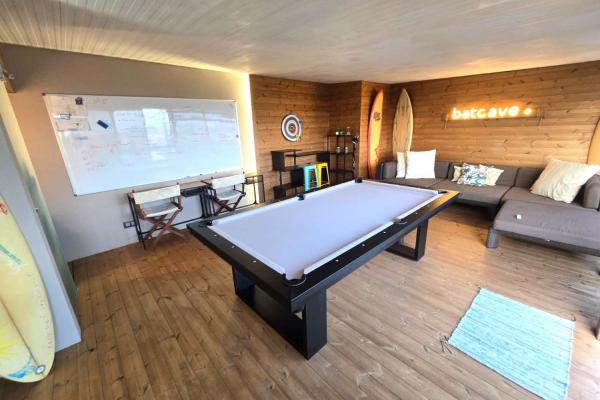 Sala cerrada de 35 m², revestida de madera natural, equipada con una mesa de billar nueva.